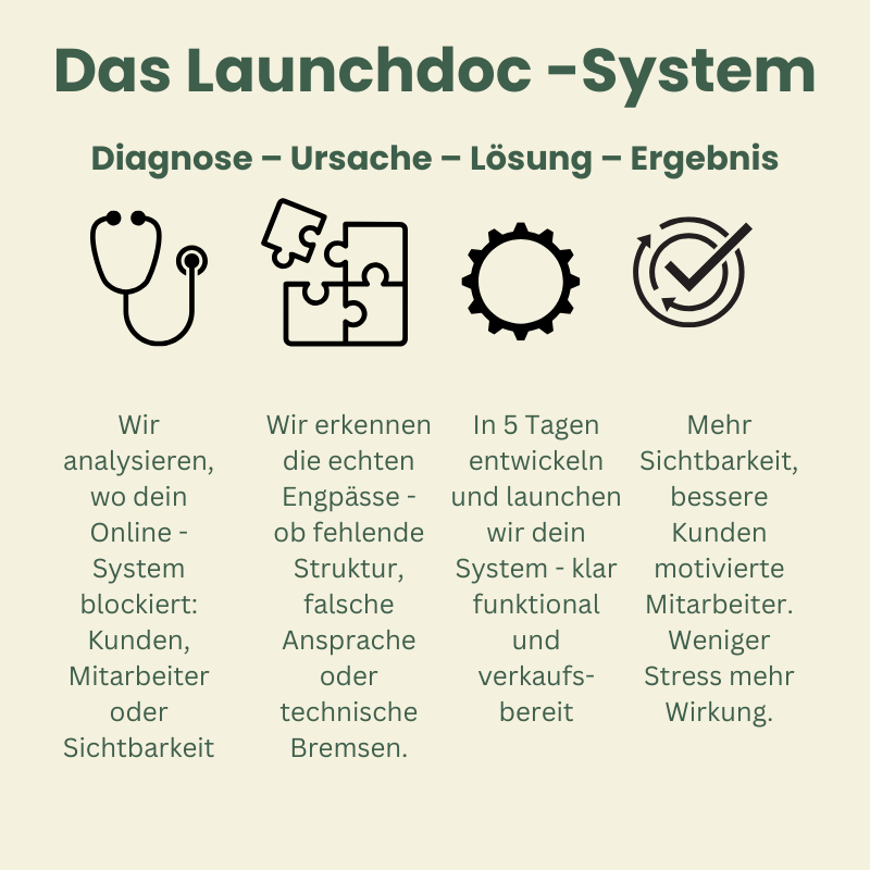 Mit dem Launchdoc-System bekommst du eine klare Struktur, die sichtbar macht, was bisher im Verborgenen blockiert hat: fehlende Strategie, unklare Ansprache oder technische Stolpersteine.
